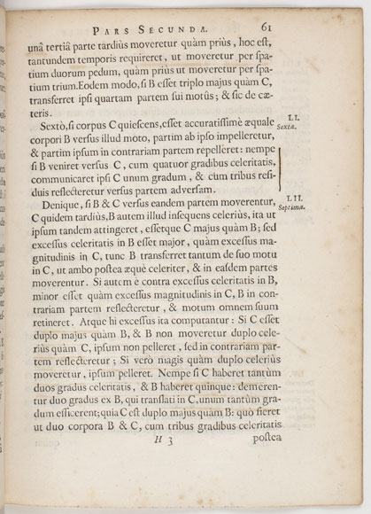 in C, B in contrariam partem reflecteretur, et motum omnem suum retineret. Atque hi excessus ita computantur : Si C esset duplo majus quàm B, et B non moveretur duplo celeriùs quàm C, ipsum non pelleret, sed in contrariam partem reflecteretur ; Si verò magis quàm duplo celeriùs moveretur, ipsum pelleret. Nempe si C haberet tantùm duos gradus celeritatis, et B haberet quinque : demerentur duo gradus ex B, qui translati in C, unum tantùm gradum efficerent ; quia C est duplo majus quàm B : quò fieret ut duo corpora B et C, cum tribus gradibus celeritatis Elzevier, p. 62![]()