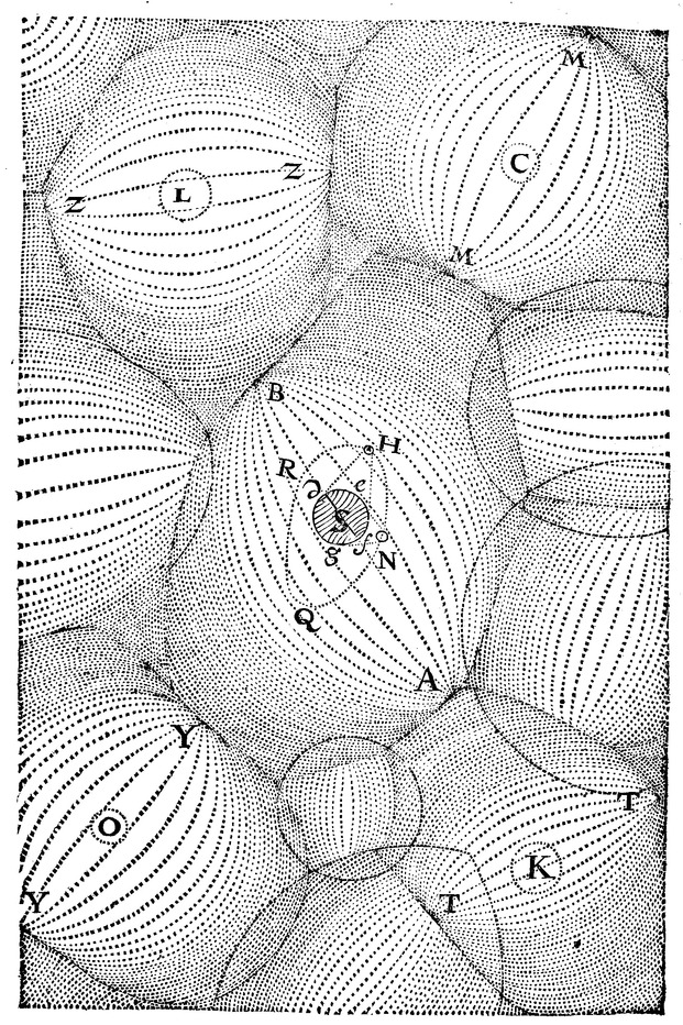 Image haute résolution sur Gallica alia aliquantò plura, quae aequent numerum planetarum. Ita scilicet ut illae omnes, quae continebantur in spatio AEINB. Vide fig. pag. seq., verterentur circa punctum S, et quae continebantur in spatio AEV, circa F, et ita de caeteris : sicque tot varios vortices componerent, quot jam astra sunt in mundo.