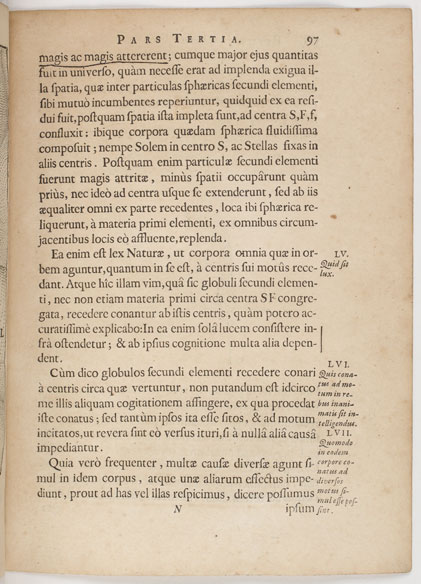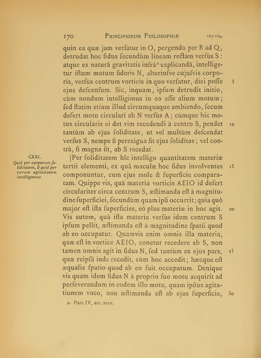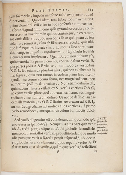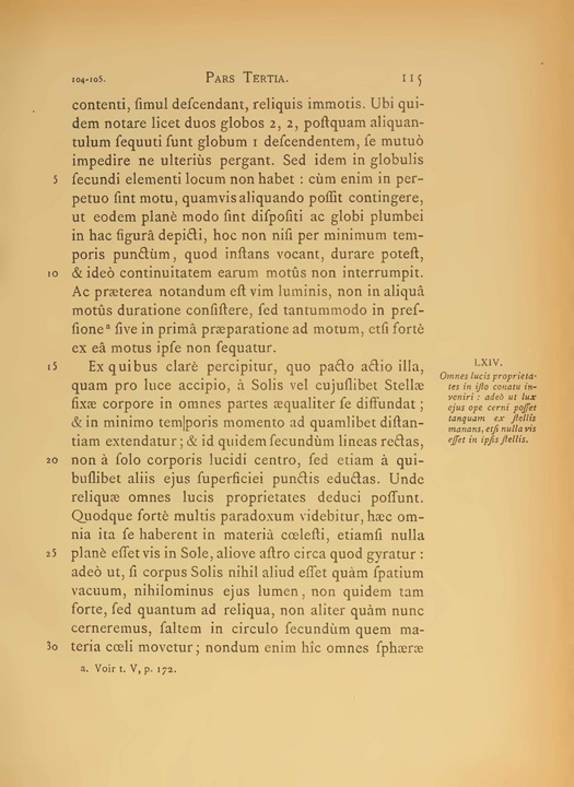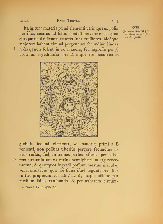 Image haute résolution sur Gallica CXXV. Quomodo quidam sint aliquo sidere magis solidi, alii minùs.Denique fieri potest, ut idem sidus minus habeat soliditatis, quàm quidam globuli coelestes, et magis quàm alii paulò minores ; tum propter jam dictam rationem, tum etiam quia, licèt non magis nec minùs sit materiae secundi elementi, in istis globulis minoribus simul sumptis, quàm in majoribus, cùm aequale spatium occupant, est tamen in ipsis multò plus superficiei ; et propter hoc à materiâ primi elementi, quae angulos iis interjectos replet, nec non etiam à quibuslibet aliis corporibus, faciliùs à cursu suo revocantur, atque versus alias partes deflectuntur, quàm alii majores.