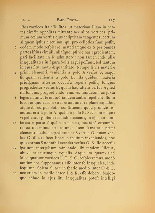Image haute résolution sur Gallica verò à Sole magis recederet, ei occurrerent globuli coelestes aliquantò minùs celeriter moti, ac proinde qui ejus agitationem minuerent ; et paullò minores, ac proinde qui vim haberent, ipsum versus Solem repellendi.