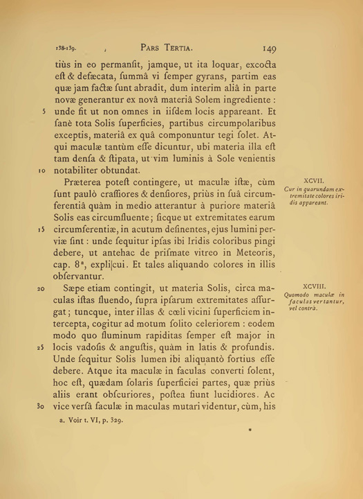 Image haute résolution sur Gallica Nec interim mirabimur, quòd maculae quae in ejus superficie apparent, multò tardiùs ferantur, quàm ullus Planeta : (quippe in brevissimo suo circuitu viginti sex dies impendunt, Mercurius autem in suo plusquàm sexagies majori, vix tres menses, et Saturnus in suo fortè bis millies majori annos tantùm triginta, qui nisi celeriùs ipsis moveretur, plus centum deberet impendere.) Hoc enim putabimus accidere ex eo, quòd particulae tertii elementi, ortae à continuâ macularum dissolutione, congregatae sint circa Solem, atque ibi magnam quandam molem aëris sive aetheris componant, fortè usque ad sphaeram Mercurii, vel etiam ulteriùs extensam ; cujus aetheris particulae, cùm sint valde irregulares et ramosae, sibi invicem sic adhaerent, ut non disjunctim concitentur, quemadmodum globuli materiae coelestis, sed omnes AT VIII-1, 197
