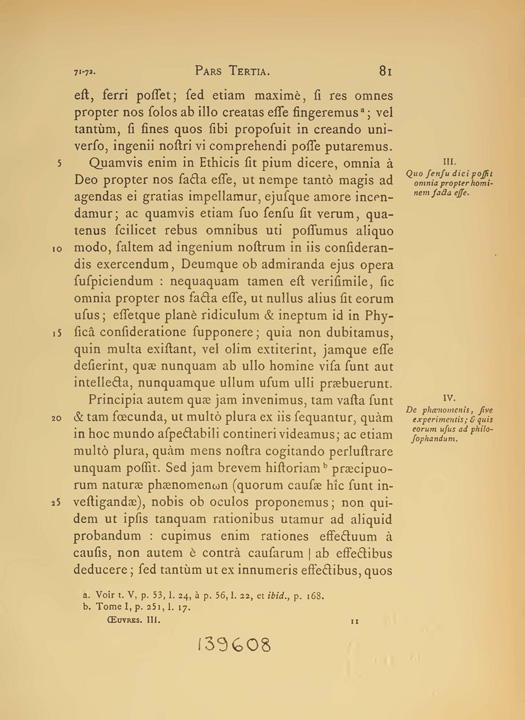 III. Quo sensu dici possit omnia propter hominem facta esse.Quamvis enim in Ethicis sit pium dicere, omnia à Deo propter nos facta esse, ut nempe tantò magis ad agendas ei gratias impellamur, ejusque amore incendamur ; ac quamvis etiam suo sensu sit verum, quatenus scilicet rebus omnibus uti possumus aliquo modo ; saltem ad ingenium nostrum in iis considerandis exercendum, Deumque ob admiranda ejus opera suspiciendum : Nequaquam tamen est verisimile, sic omnia propter nos facta esse, ut nullus alius sit eorum usus ; essetque planè ridiculum et ineptum id in Physicâ consideratione supponere ; quia non dubitamus, quin multa exsistant, vel olim extiterint, jamque esse desierint, quae nunquam ab ullo homine visa sunt aut intellecta, nunquamque ullum usum ulli praebuerunt.