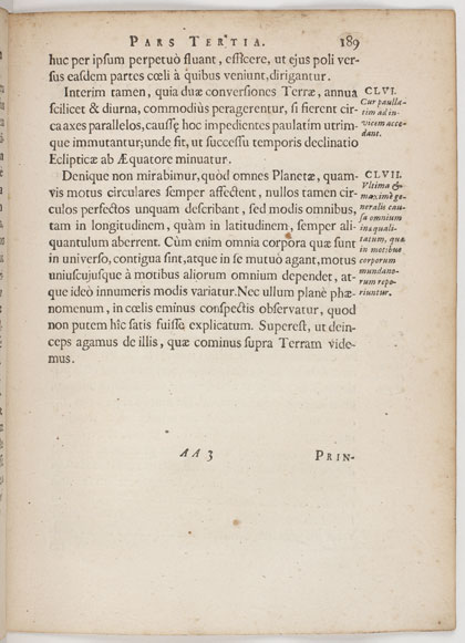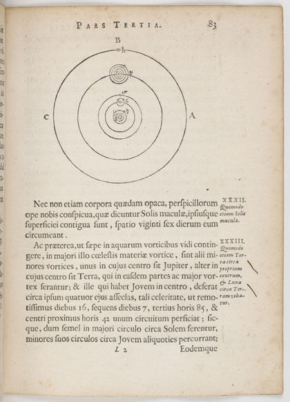 Image haute résolution sur Gallica XXIV. Coelos esse fluidos.Tertiò, putandum est, non tantùm Solis et Fixarum, sed totius etiam coeli materiam fluidam esse, sive liquidam : quod jam vulgò omnes Astronomi concedunt, quia vident phaenomena Planetarum vix aliter posse explicari.