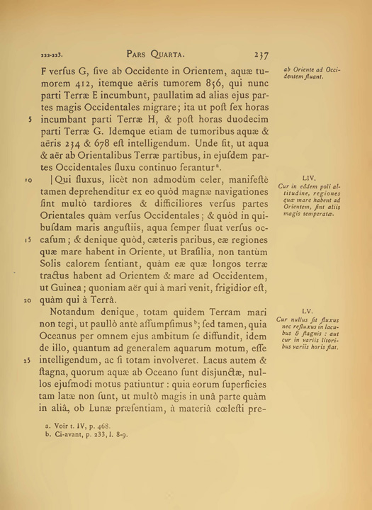 aliis 234, supra ipsam exsistentibus, quia si haec deorsum ferrentur, deberent aliae guttae 567 aut similes in earum locum ascendere ; quae, cùm sint aequè graves, illarum descensum impediunt. Hae autem guttae 1234, junctis viribus premunt partem fundi B ; quia, si efficiant ut descendat, descendent etiam ipsae, ac in earum locum partes aëris 89, quae sunt ipsis leviores, ascendent. Sed eandem vasis partem B, non plures guttae premunt quàm hae 1234, vel aliae ipsis aequipollentes ; quia eo temporis momento, quo haec pars B potest descendere, non plures eam sequi possunt. Atque hinc innumera experimenta circa corporum gravitatem, vel potiùs, si sic loqui licet, gravitationem, quae malè philosophantibus mira videntur, perfacile est explicare.