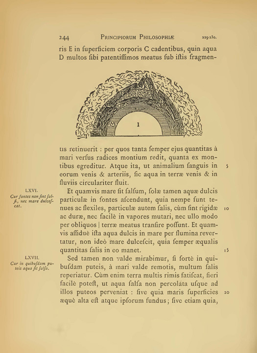 XIV. De primâ formatione diversorum corporum, in tertiâ Terrae regione. Cùm autem postea globus Terrae, in tres istas regiones distinctus, versus Solem devolutus est, (vortice scilicet in quo antea erat absumto) non magna quidem mutatio, in intimâ et mediâ ejus regione potuit inde oriri ; sed quantùm ad exteriorem, primùm duo, deinde tria, postmodum quatuor, et plura alia corpora diversa, in ea distingui debuerunt.