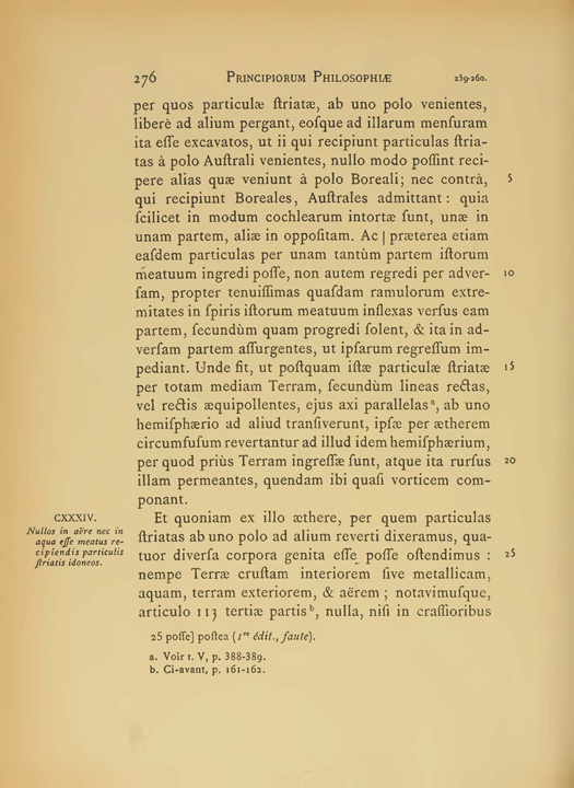 et ad ipsam quoque esse referendas illas particulas terrestres, quae cursum ejus sequutae, caeteris celeriùs moventur ; quales sunt eae omnes quae aërem componunt. Advertendum praeterea, materiam primi elementi, caeteris paribus, majorem vim habere ad corpora terrestria deorsum pellenda, quàm globulos secundi, quia plus habet agitationis ; et hos majorem, quàm particulas terrestres aëris quas secum movent, ob similem rationem. Unde fit, ut ex solâ gravitate non facilè possit aestimari, quantum in quoque corpore materiae terrestris contineatur. Et fieri potest, ut quamvis, exempli caussâ, massa auri vicies plus ponderet, quàm moles aquae ipsi aequalis, non tamen quadruplo vel quintuplo plus materiae terrestris contineat : tum, quia tantundem ab utraque subducendum est, propter aërem in quo ponderantur ; tum etiam, quia in ipsâ aquâ, ut et in omnibus aliis liquidis corporibus, propter suarum particularum motum, inest levitas, respectu corporum durorum.