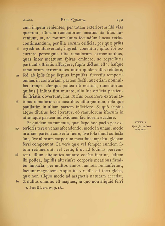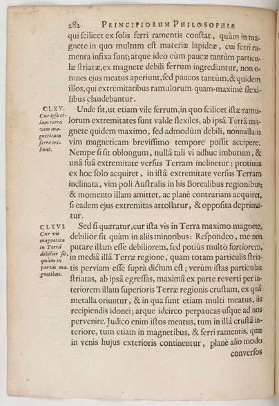 CLXIX. Cur etiam interdum ista declinatio cum tempore mutetur. Sunt qui dicunt, istam declinationem non semper in iisdem terrae locis eandem manere, sed cum tempore mutari : quod minimè mirum videri debet ; non modò quia ferrum quotidie, ex unis terrae partibus in alias ab hominibus transfertur ; sed etiam quia ejus glebae, quae sunt in hac terrâ exteriore, quibusdam in locis cum tempore corrumpi possunt, et aliae in aliis generari, sive ab interiore terrâ submitti.