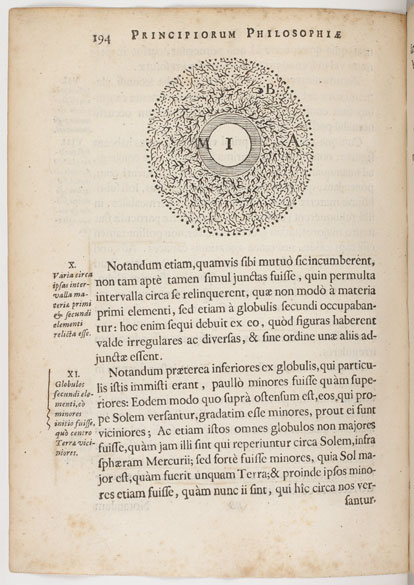 Image haute résolution sur Gallica et cujus suprema regio constat particulis tertii elementi, sibi mutuò non firmiter annexis, quibus immisti sunt globuli coelestes, aliquantò minores iis, qui reperiuntur in ea coeli parte per quam transit, vel etiam in eâ ad quam venit, facilè intelligemus minores istos globulos, majusculis qui eam circumplectuntur loca sua relinquere ; hosque majusculos in illa cum impetu ruentes, in multas tertii elementi particulas impingere, praesertim in crassiores, ipsasque infra caeteras detrudere, juvante etiam ad hoc vi gravitatis ; atque ita efficere ut istae crassiores infra caeteras depulsae, figurasque habentes irregulares et varias, arctiùs inter se nectantur quàm superiores, et motus globulorum coelestium interrumpant. Quò fit, ut suprema Terrae regio,