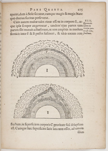 XXXIX. De hujus quarti corporis accretione, et tertii expurgatione. Et quidem non longo tempore opus fuit, ut Terrę suprema regio A, in duo corpora B et C distingueretur ; nec etiam ut multae particulę oblongae coacervarentur versus D ; nec denique, ut prima interior crusta corporis E formaretur. Sed non nisi spatio plurium annorum particulae corporis D, ad duas species paullò antè descriptas reduci, atque omnes crustae corporis E formari potuerunt. Neque enim initio ratio fuit, cur particulae quae confluebant versus D, non essent unae aliis paullò crassiores et longiores, Elzevier, p. 212![]()