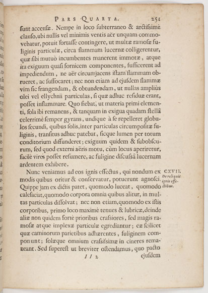 XXIX. De quartâ quae est calor : quid sit, et quomodo sublato lumine perseveret. Haec autem particularum terrestrium agitatio, sive orta sit à lumine, sive ab aliâ quavis caussâ, calor vocatur ; praesertim cùm est major solito, et movet sensum ; caloris enim denominatio ad sensum tactûs refertur. Notandumque est unamquamque ex particulis terrestribus sic agitatam, perseverare postea in suo motu juxta leges naturae, donec ab aliquâ aliâ caussâ sistatur ; atque ideò calorem à lumine ortum, semper aliquamdiu post sublatum lumen remanere.