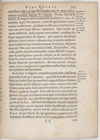 CCI. Dari particulas corporum insensiles. At multas in singulis corporibus particulas considero, quae nullo sensu percipiuntur : quod illi fortasse non probant, qui sensus suos pro mensurâ cognoscibilium sumunt. Quis autem potest dubitare, quin multa corpora sint tam minuta, ut ea nullo sensu deprehendamus, si tantùm consideret, quidnam singulis horis adjiciatur iis quae lentè augentur, vel quid detrahatur ex iis quae minuuntur ? Crescit arbor quotidie, nec potest intelligi majorem illam reddi, quàm prius fuit, nisi simul intelligatur aliquod corpus ei adjungi. Quis autem unquam sensu deprehendit, quaenam sint illa corpuscula, quae in unâ die arbori crescenti accesserunt Atque saltem illi, qui agnoscunt quantitatem esse indefinitè divisibilem, fateri debent ejus partes reddi posse Elzevier, p. 306![]()