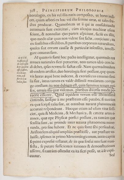 CCIV. Sufficere si de insensibilibus qualia esse possint, explicuerim, etsi fortè non talia sint. At quamvis fortè hoc pacto intelligatur, quomodo res omnes naturales fieri potuerint, non tamen ideò concludi debet, ipsas revera sic factas esse. Nam quemadmodum ab eodem artifice, duo horologia fieri possunt, quę quamvis horas aequè bene indicent, et extrinsecus omnino similia sint, intus tamen ex valde dissimili rotularum compage constant ; ita non dubium est, quin summus rerum opifex, omnia illa, quae videmus, pluribus diversis modis potuerit efficere. Quod equidem verum esse libentissimè concedo, satisque à me praestitum esse putabo, si tantùm ea quae scripsi talia sint, ut omnibus naturae phaenomenis accuratè respondeant. Hocque etiam ad usum vitae sufficiet, quia et Medicina, et Mechanica, et caeterae artes omnes, quae ope Physicae perfici possunt, ea tantùm quae sensilia sunt, ac proinde inter naturae phaenomena numeranda, pro fine habent. Et ne quis fortè sibi persuadeat, Aristotelem aliquid ampliùs praestitisse, aut praestare voluisse, ipsemet in primo Meteorologicorum, initio capitis septimi expressè testatur, de iis quae sensui non sunt manifesta, se putare sufficientes rationes et demonstrationes afferre, si tantùm ostendat ea ita fieri posse, ut à se explicantur.