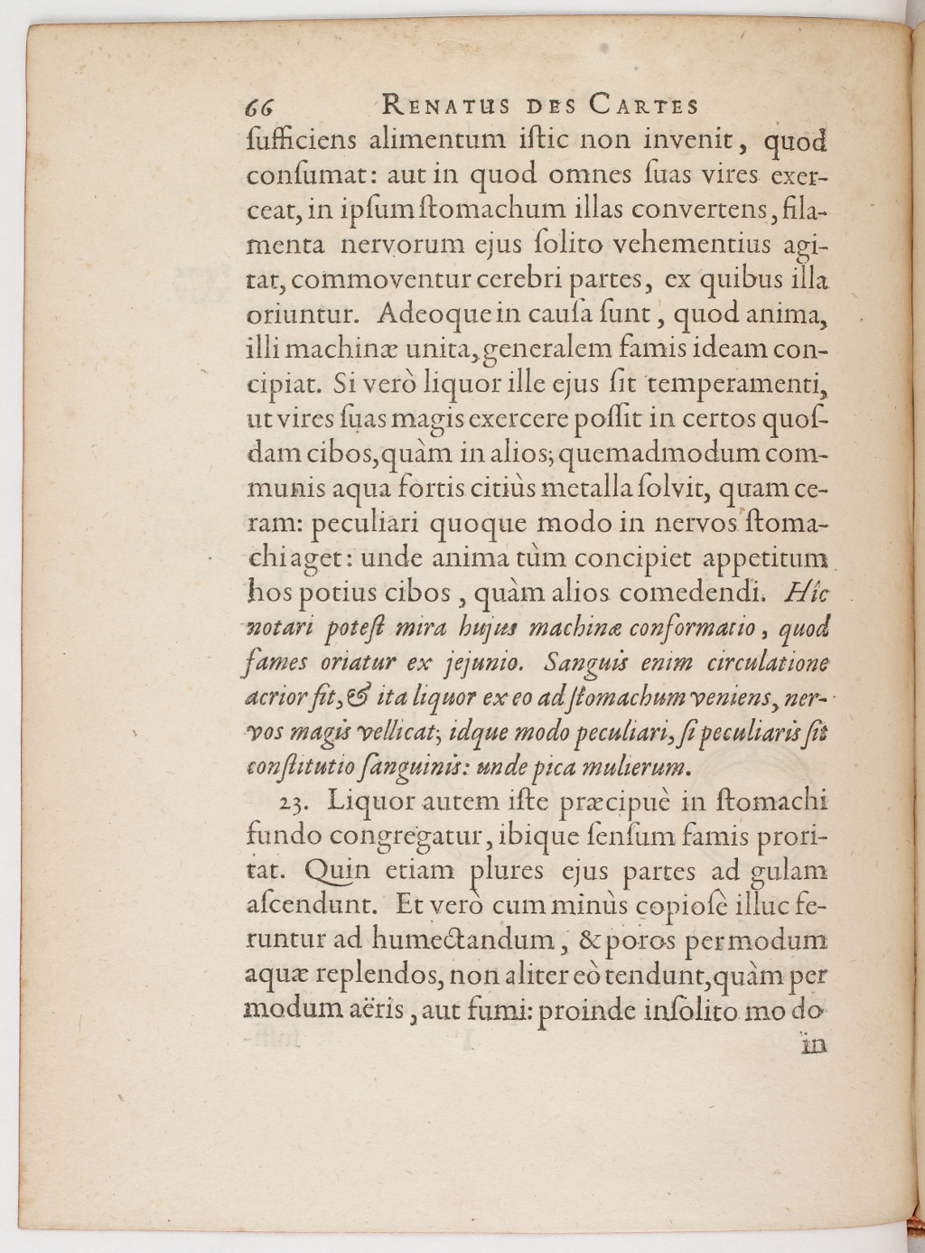 Image haute résolution sur Gallica ad cerebrum quoscunque etiam omnium minimos motus referre queant : sed omnium minimos motus, quibus cerebrum afficiunt, esse eos, quos crassiores corporum terrestrium particulae causantur. Et verò quaedam istius generis particulae, quamlibet satis crassae, tàm leniter nihilominus haec filamenta offendunt, ut ea vel premant, vel illico amputent, neque tamen ipsarum actio ad cerebrum perveniat. Quemadmodum et pharmacis quibusdam vis inest torporem inducendi : quinetiam actiones nostrorum membrorum, quibus applicantur, corrumpendi, atque adeò omnem sensum intercipiendi.