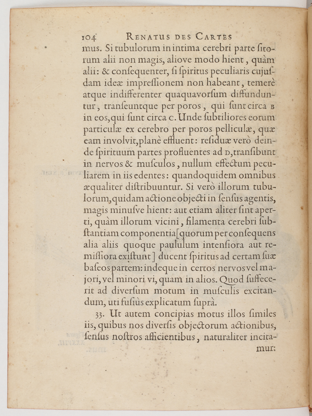 Image haute résolution sur Gallica Si tubulorum in intima cerebri parte sitorum alii non magis, aliove modo hient, quàm alii : et consequenter, si spiritus peculiaris cujusdam ideae impressionem non habeant, temerè atque indifferenter quaquavorsum diffunduntur, transeuntque per poros, qui sunt circa B in eos, qui sunt circa C. Unde subtiliores eorum particulae ex cerebro per poros pelliculae, quae eam involvit, planè effluent : residuae verò deinde spirituum partes profluentes ad D, transibunt in nervos et musculos, nullum effectum peculiarem in iis edentes : quandoquidem omnibus aequaliter distribuuntur. Si verò illorum tubulorum, quidam actione objecti in sensus agentis, magis minusve hient : aut etiam aliter sint aperti, quàm illorum vicini, filamenta cerebri substantiam componentia [quorum per consequens alia aliis quoque paululum intensiora aut remissiora existunt] ducent spiritus ad certam suae baseos partem : indeque in certos nervos vel majori, vel minori vi, quam in alios. Quod suffecerit ad diversum motum in musculis excitandum, uti fusiùs explicatum suprà.