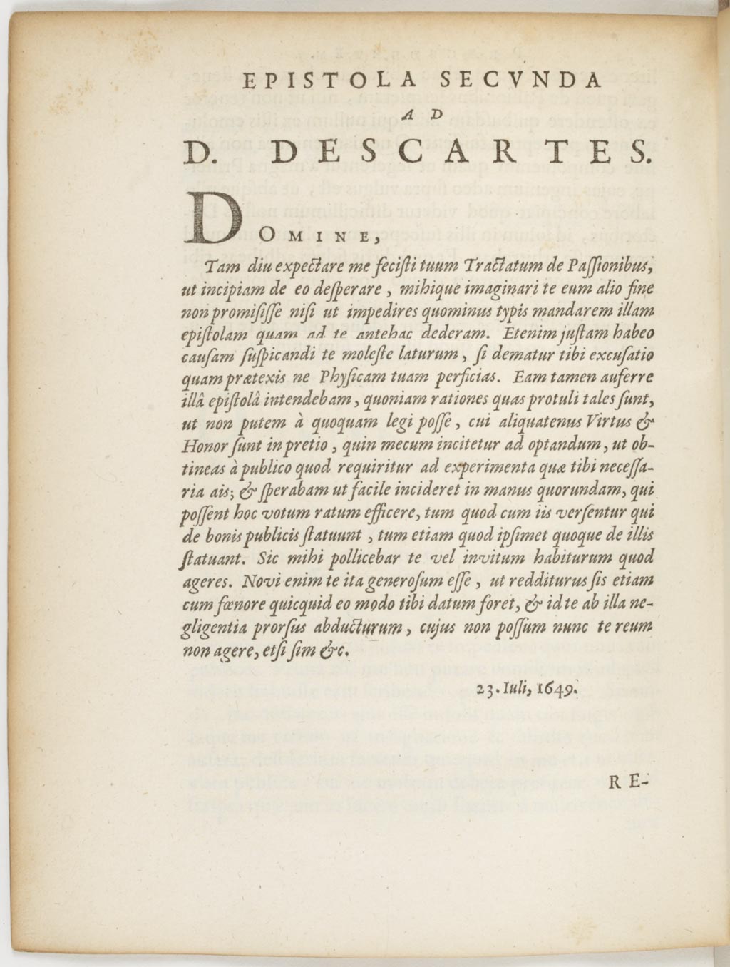 Tam diu expectare me fecisiti tuum Tractatum de Passionibus, ut incipiam de eo desperare, mihique imaginari te eum alio fine non promisisse nisi ut impedires quominus typis mandarem illam epistolam quam ad te antehac dederam. Etenim justam habero causam suspicandi te moleste laturum, si dematur tibi excusatio quam praetexis ne Physicam tuam perficias. Eam tam auferre illâ epistolâ intendebam, quoniam rationes quas protuli tales sunt, ut non putem à quoquam legi posse, cui aliquatenus Virtus et Honor sunt in pretio, quin mecum incitetur ad optandum, ut obtineas à publico quod requiritur ad experimenta quae tibi necessaria ais ; et sperabam ut facile incideret in manum quorundam, qui possent hoc votum ratum efficere, tum quod cum iis versentur qui de bonis publicis statuunt, tum etiam quod ipsimet quoque de illis statuant. Sic mihi pollicebar te vel invitum habiturum quod ageres. Novi enim te ita generosum esse, ut redditurus sis etiam cum foenore quicquid eo modo tibi datum foret, et id te ab illa negligentia prorsus abducturum, cujus non possum nunc te reum non agere, etsi sim etc.