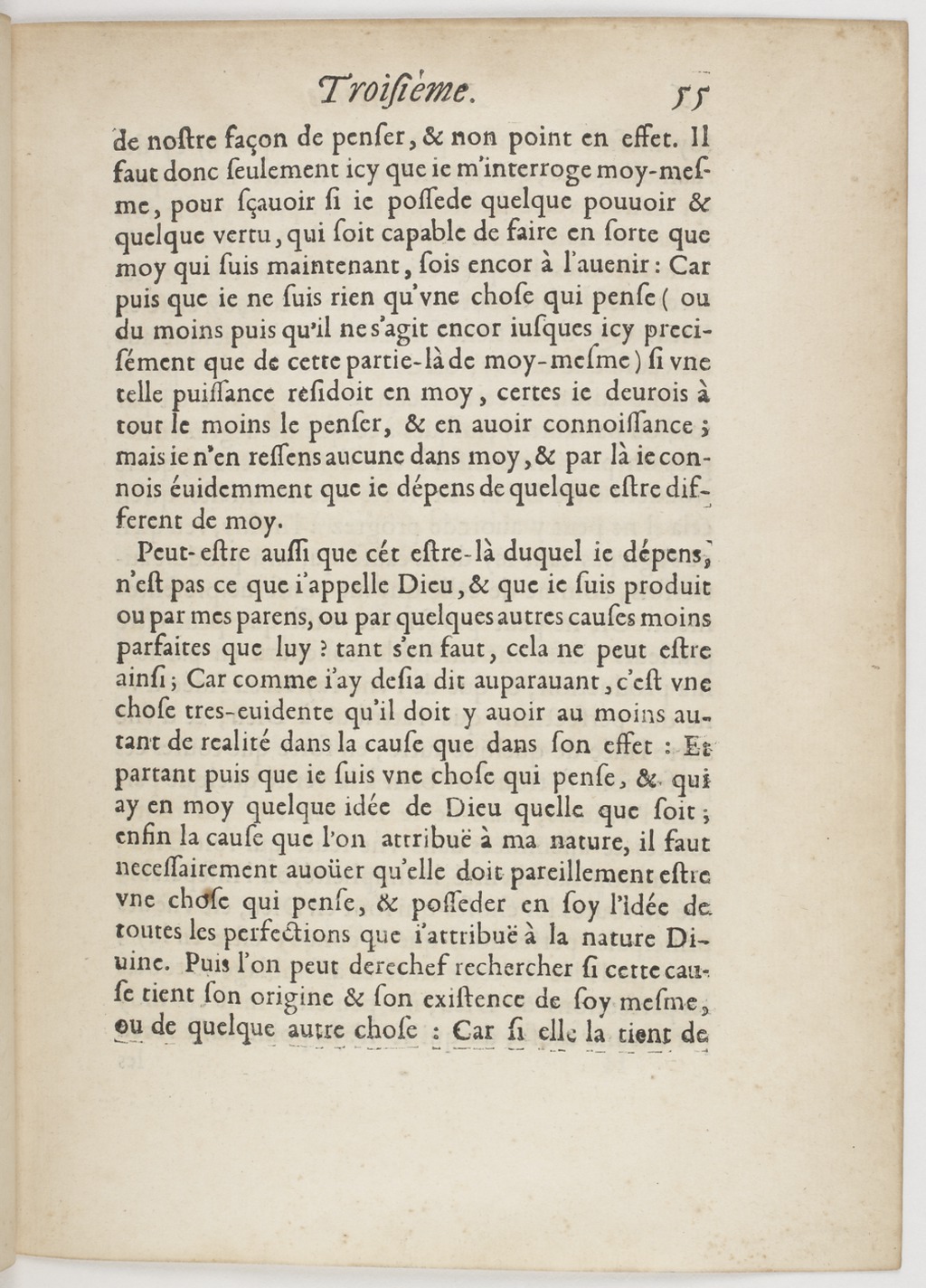 Image haute résolution sur Gallica si moy-mesme qui ay cette idée de Dieu ie pourrois estre, en cas qu’il n’y eust point de Dieu. Et ie demande, de qui aurois-je mon existence? peut-estre de moy-mesme, ou de mes parens, ou bien de quelques autres causes moins parfaites que Dieu ; car on ne se peut rien imaginer de plus parfait ny mesme d’égal à luy.
