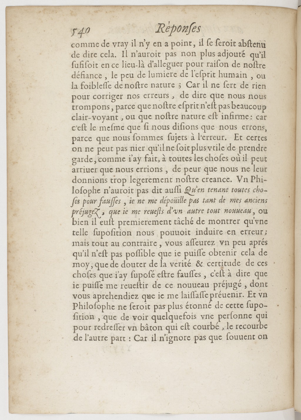, ou bien il eust premierement tâché de montrer qu’vne telle suposition nous pouuoit induire en erreur ; mais tout au contraire, vous asseurez vn peu aprés qu’il n’est pas possible que ie puisse obtenir cela de moy, que de douter de la verité et certitude de ces choses que i’ay suposé estre fausses, c’est à dire que ie puisse me reuestir de ce nouueau préjugé, dont vous aprehendiez que ie me laissasse préuenir. Et vn Philosophe ne seroit pas plus étonné de cette suposition, que de voir quelquefois vne personne qui pour redresser vn bâton qui est courbé, le recourbe de l’autre part : Car il n’ignore pas que souuent on Camusat – Le Petit, p. 541![]()