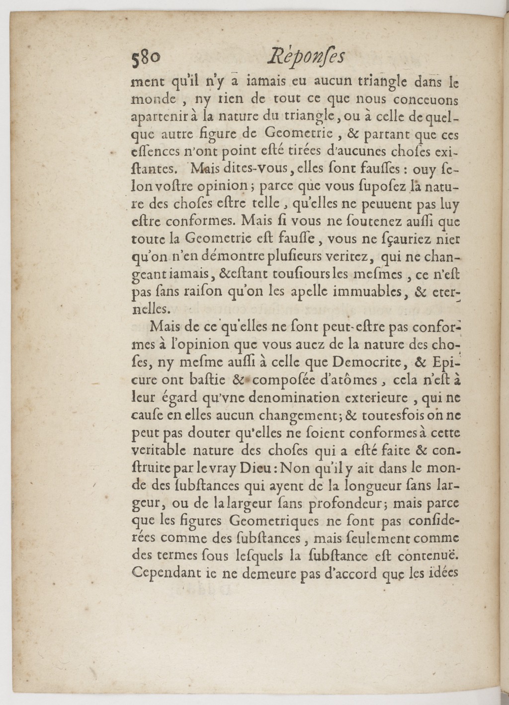 Image haute résolution sur Gallica qu’il n’y a iamais eu aucun triangle dans le monde, ny rien de tout ce que nous conceuons apartenir à la nature du triangle, ou à celle de quelque autre figure de Geometrie, et partant que ces essences n’ont point esté tirées d’aucunes choses existantes. Mais dites-vous, elles sont fausses : ouy selon vostre opinion ; parce que vous suposez la nature des choses estre telle, qu’elles ne peuuent pas luy estre conformes. Mais si vous ne soutenez aussi que toute la Geometrie est fausse, vous ne sçauriez nier qu’on n’en démontre plusieurs veritez, qui ne changeant iamais, et estant tousiours les mesmes, ce n’est pas sans raison qu’on les apelle immuables, et eternelles.