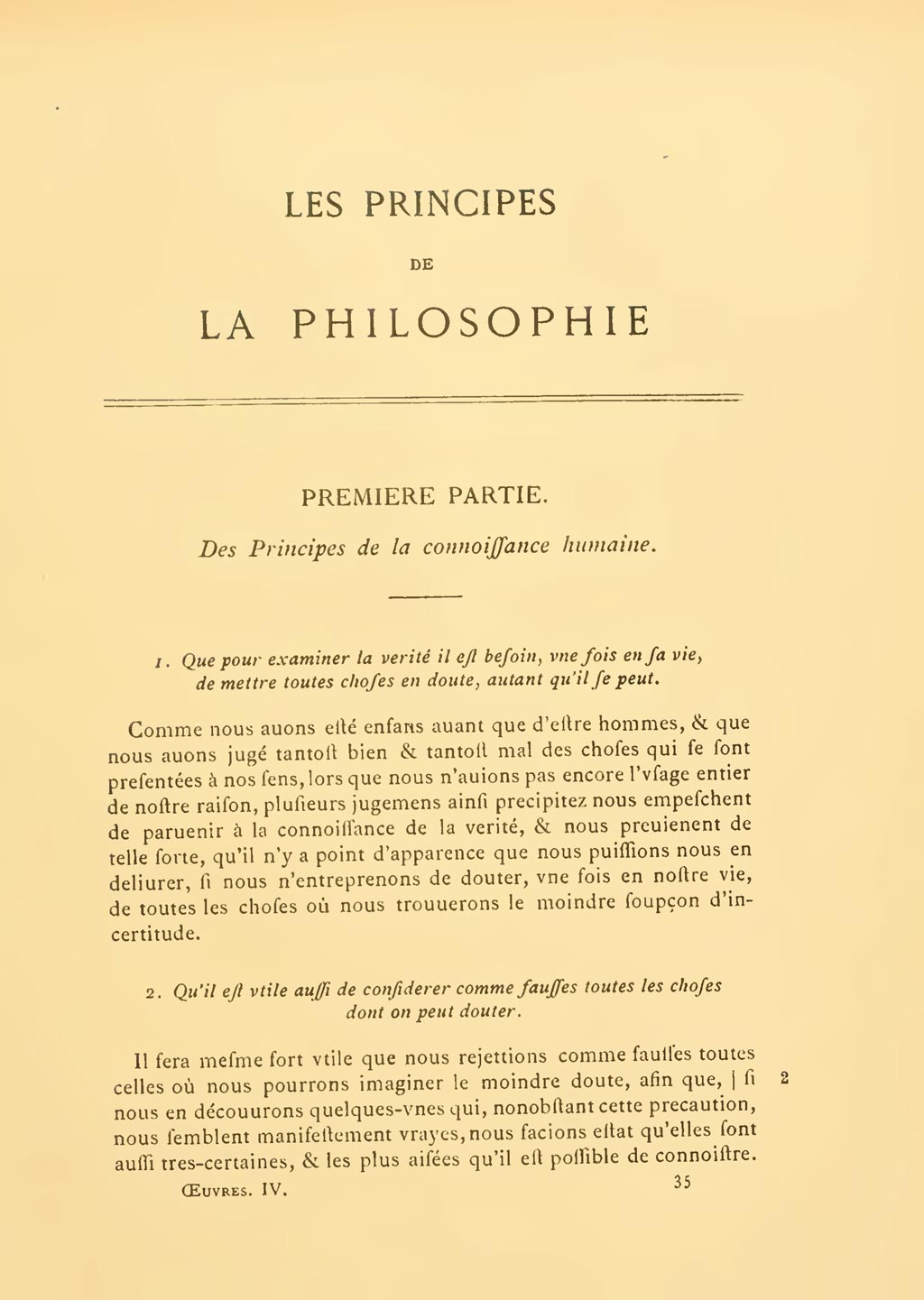 I. Que pour examiner la verité il est besoin vne fois en sa vie de mettre toutes choses en doute, auta̋t qu’il se peut. Comme nous auons esté enfans auant que d’estre hommes, et que nous auons jugé tantost bien et tantost mal des choses qui se sont presentées à nos sens, lors que nous n’auions pas encore l’vsage entier de nostre raison, plusieurs jugemens ainsi précipitez nous empeschent de paruenir à la connoissance de la verité, et nous preuienent de telle sorte qu’il n’y a point d’apparence que nous puissions nous en deliurer, si nous n’entreprenons de douter vne fois en nostre vie de toutes les choses où nous trouuerons le moindre soupçon d’incertitude.