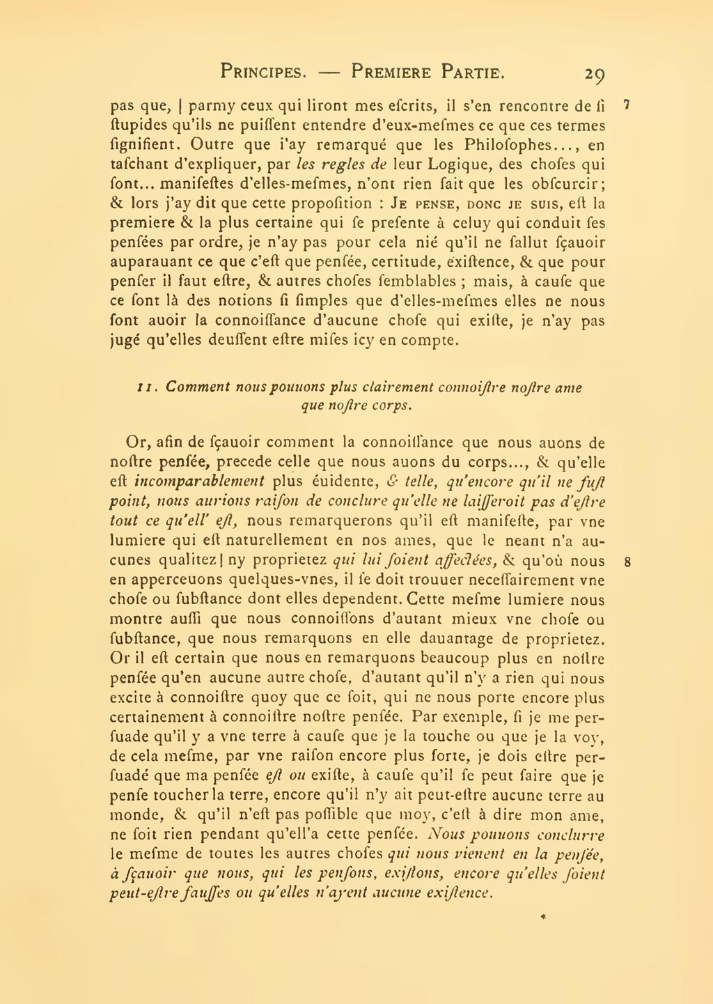 Image haute résolution sur Gallica parmy ceux qui liront mes escrits il s’en rencontre de si stupides qu’ils ne puissent entendre d’eux-mesmes ce que ces termes signifient. Outre que j’ay remarqué que les Philosophes en taschant d’expliquer par les regles de leur Logique des choses qui sont manifestes d’elles-mesmes n’ont rien fait que les obscurcir, et lors que j’ay dit que cette proposition, Ie pense, donc je suis, est la premiere et la plus certaine qui se presente à celuy qui conduit ses pensées par ordre : Ie n’ay pas pour cela nié qu’il ne fallut sçauoir auparauant ce que c’est que pensée, certitude, existence, et que pour penser il faut estre, et autres choses semblables : mais à cause que ce sont là des notions si simples que d’elles-mesmes elles ne nous font auoir la connoissance d’aucune chose qui existe, je n’ay pas jugé qu’elles deussent estre mises icy en compte.