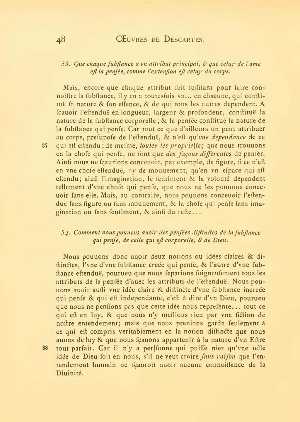 Image haute résolution sur Gallica chacune. Lors que nous cõceuons la substance, nous conceuons seulement vne chose qui existe en telle façon qu’elle n’a besoin que de soy-mesme pour exister. En quoy il peut y auoir de l’obscurité touchant l’explication de ce mot, n’auoir besoin que de soy-mesme, car à proprement parler il n’y a que Dieu qui soit tel, et il n’y a aucune chose creée qui puisse exister vn seul moment sans estre soustenuë et conseruée par sa puissance. C’est pourquoy on a raison dans l’Escole de dire que le nom de substance n’est pas vniuoque au regard de Dieu et des créatures, c’est à dire qu’il n’y a aucune signification de ce mot, que nous conceuions distinctement, laquelle conuienne à luy et à elles ; mais pource qu’entre les choses creées quelques-vnes sont de telle nature qu’elles ne peuuent exister sans quelques autres, nous les distinguons d’auec celles qui n’ont besoin que du concours ordinaire de Dieu en nommant celles-cy, des substances ; et celles-là, des qualitez ou des attributs de ces substances.