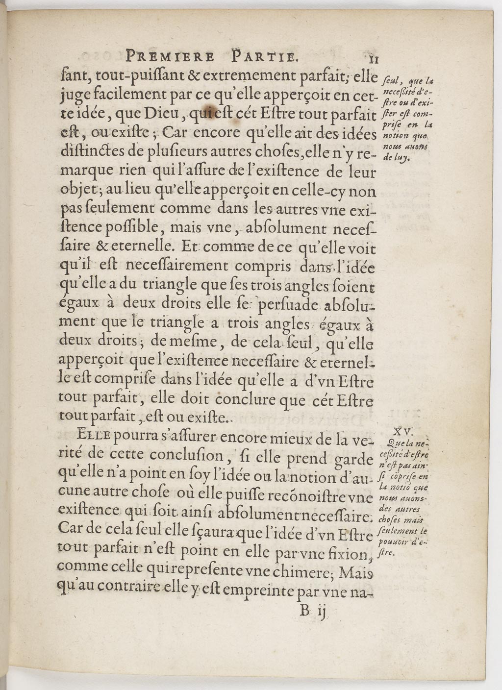 XIV. Qu’on peut demontrer qu’il y a vn Dieu de cela seul, que la necessité d’estre ou d’exister est comprise en la notion que nous auons de luy. Lors que par apres elle fait vne reveuë sur les diuerses idées ou notions qui sont en soy, et qu’elle y trouue celle d’vn estre tout connoissant, Le Gras, p. 11![]()