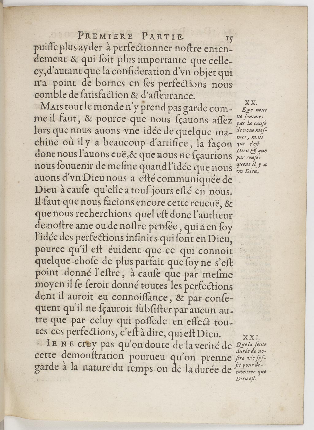 Image haute résolution sur Gallica ainsi que lors qu’on nous dit que quelqu’vn a l’idée d’une machine où il y a beaucoup d’artifice, nous auons raison de nous enquerir comment il a pu auoir cette idée ; à sauoir s’il a veu quelque part vne telle machine faite par vn autre, ou s’il a si bien apris la science des mechaniques, ou s’il est auantagé d’une telle viuacité d’esprit que de luy-même il ait peu l’inventer sans auoir rien veu de semblable ailleurs, à cause que tout l’artifice qui est representé dans l’idée qu’a cét homme, ainsi que dans vn tableau doit estre en sa premiere et principale cause, non pas seulement par imitation, mais en effet de la mesme sorte, ou d’une façon encore plus éminente qu’il n’est representé.