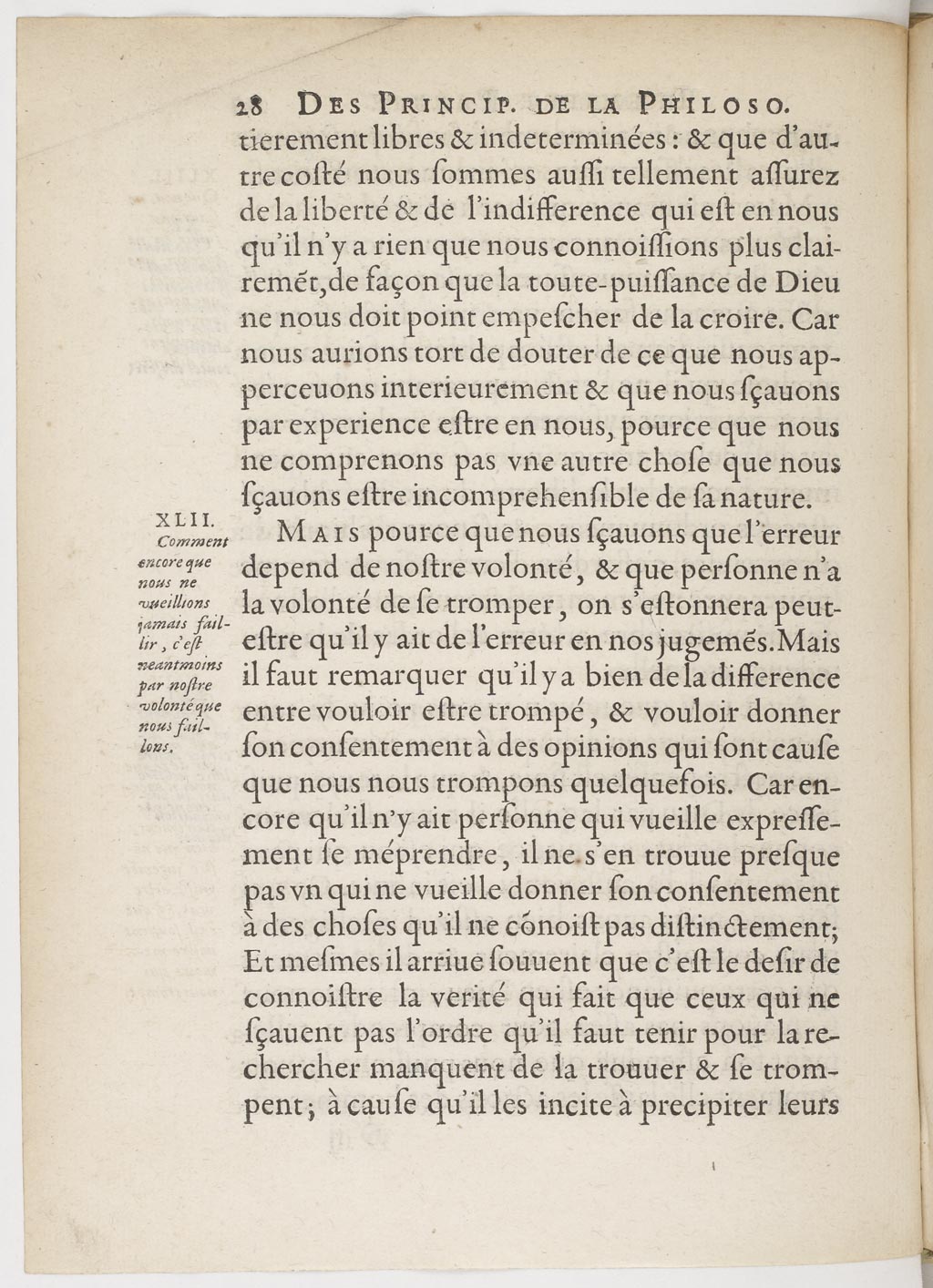 XLII. Comment encore que nous ne vueillions jamais faillir, c’est neantmoins par nostre volonté que nous faillons. Mais pource que nous sçauons que l’erreur depend de nostre volonté, et que personne n’a la volonté de se tromper, on s’estonnera peut-estre qu’il y ait de l’erreur en nos jugemẽs. Mais il faut remarquer qu’il y a bien de la difference entre vouloir estre trompé, AT IX-2, 43